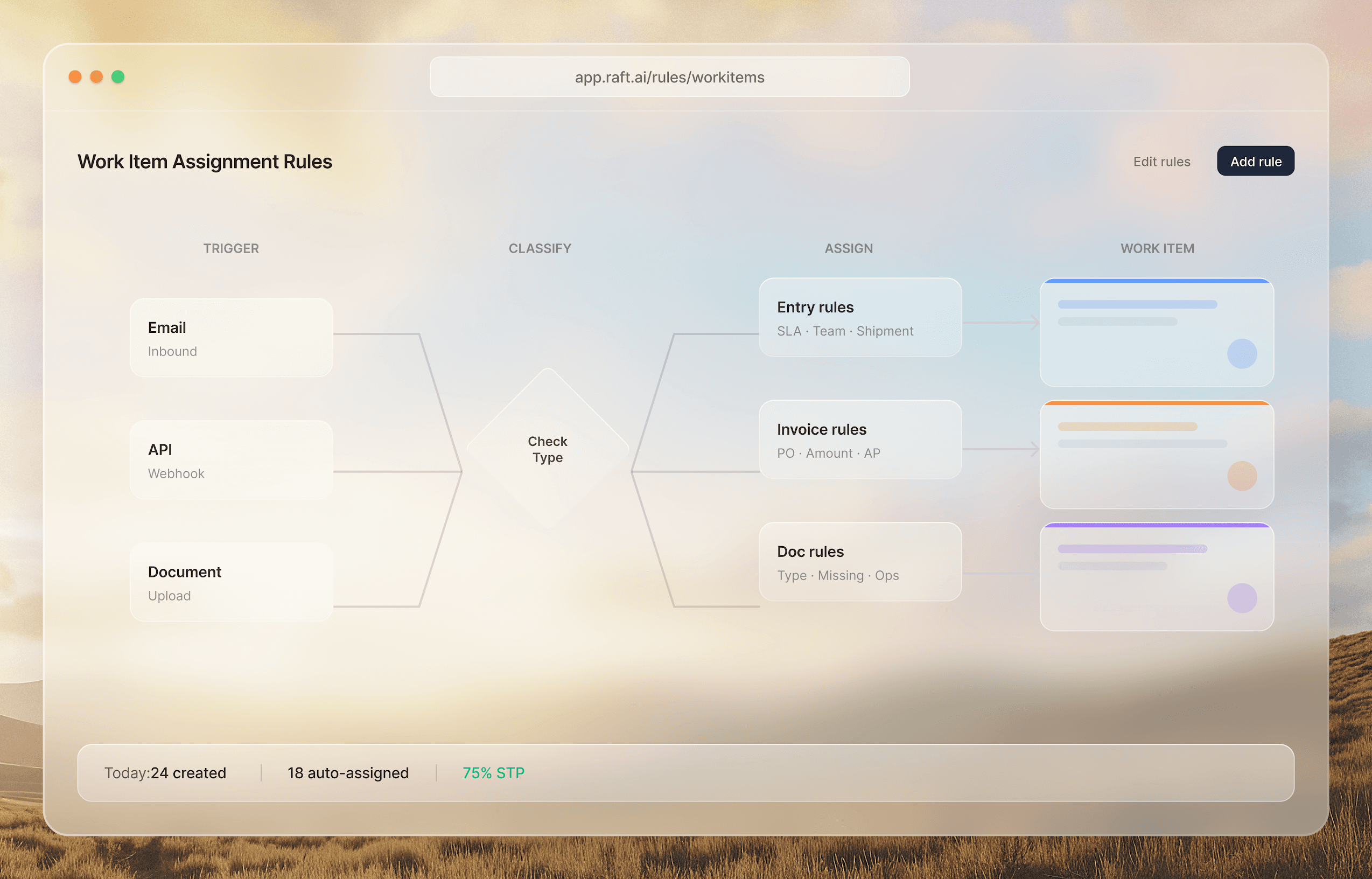 Every counterparty works differently. Raft normalizes their booking formats, notification styles, and document preferences into your standard workflows. Your operational logic, codified once, executed by agents every time.