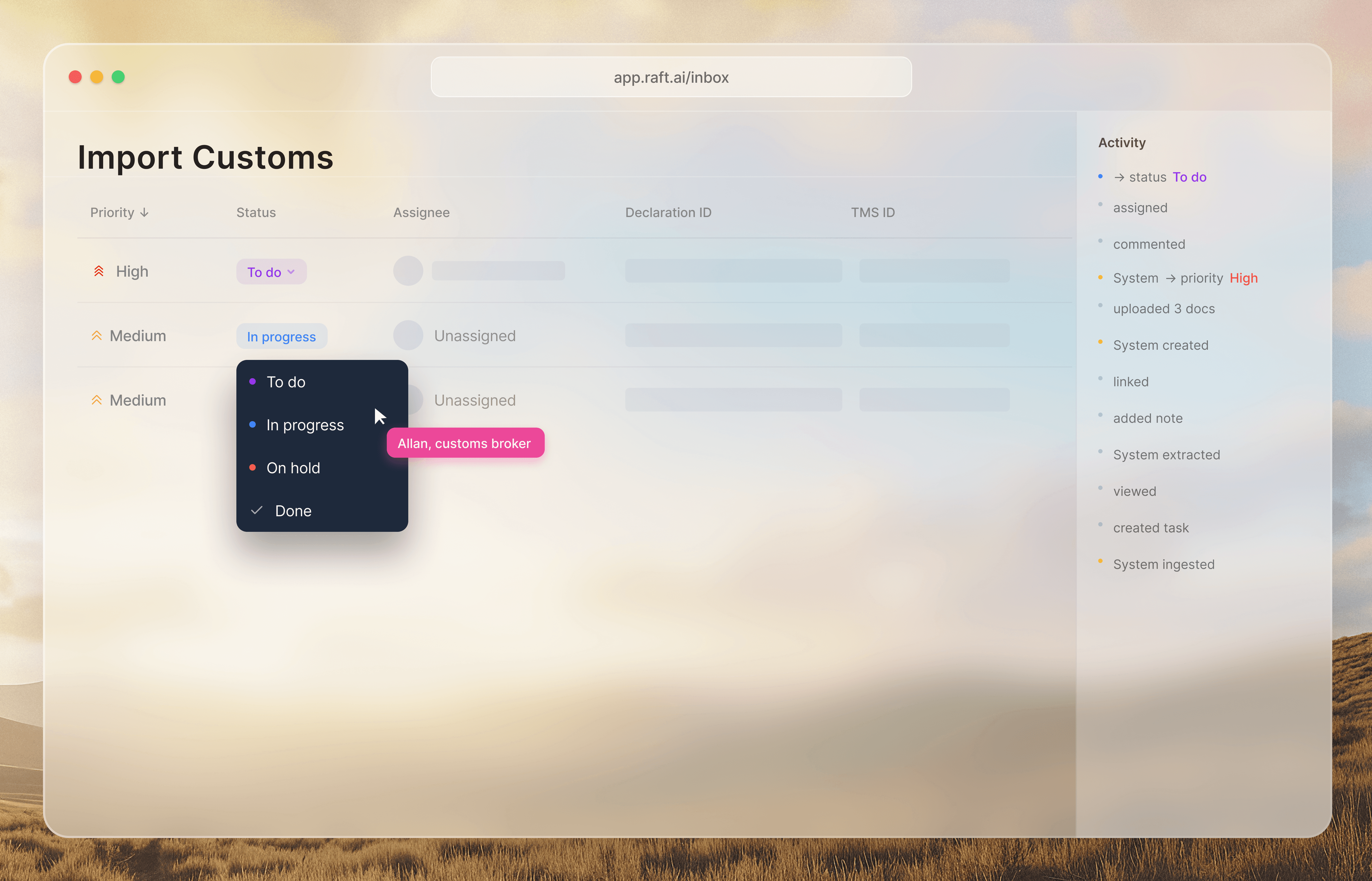 A centralized workspace with granular role-based access, complete audit trails, and task tracking at shipment-level granularity. Native email integration keeps external communication and internal context unified.