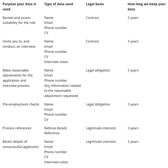 This section sets out the types of data collected and reason it is used to support your job application. For successful applicants, please refer to our internal employee privacy notice.