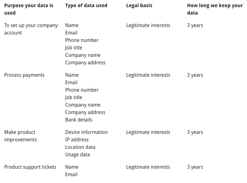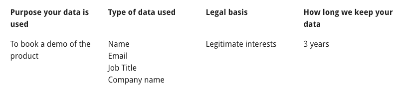 We have a legitimate interest in processing your personal data in order to facilitate a demo of our product, provide the services under the contract, and assess your application for future employment at the company . If we were unable to process this data, we would not be able to offer you the services that had been purchased under the terms of the contract or facilitate an adequate process for assessing potential employees.