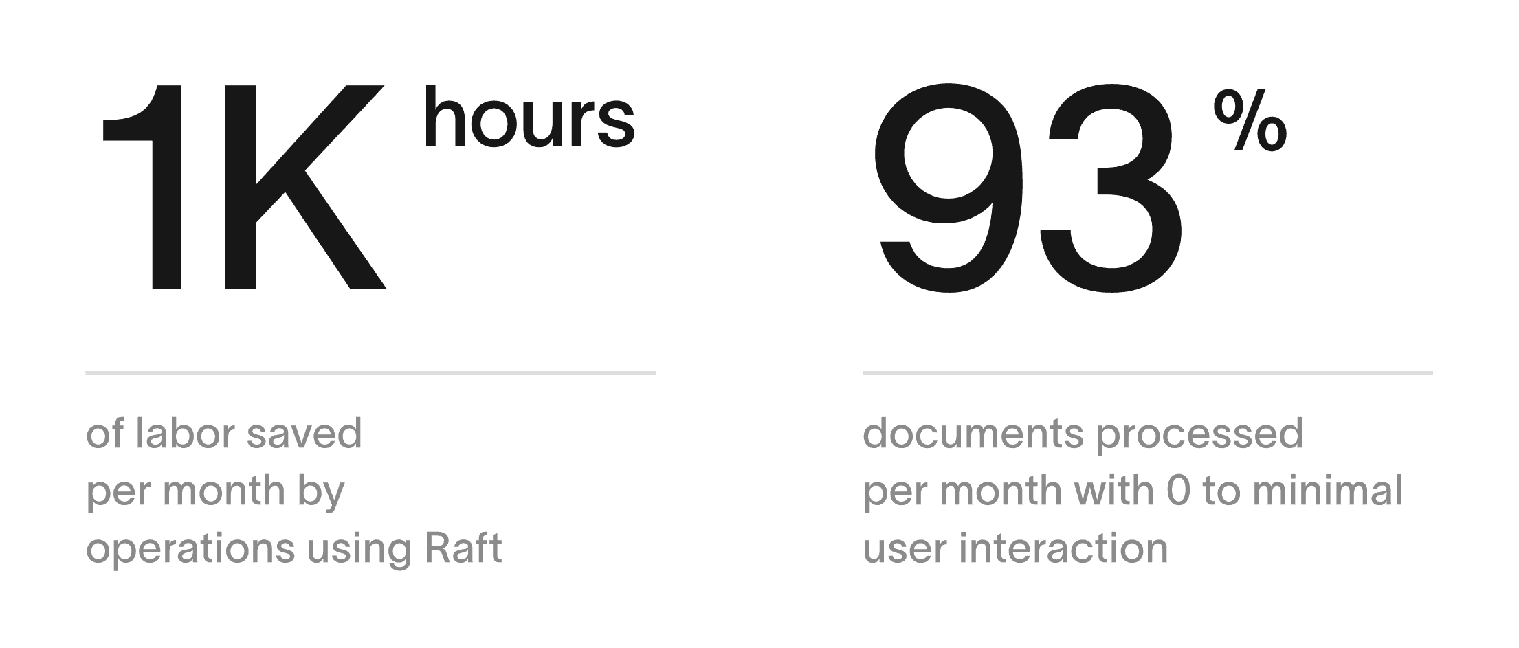 Streamlined document processing: From AP invoices to Pre-Alerts, Masterpiece is automating up to 93% of documents each month with zero to minimal user interaction using Raft. In one month alone, operators processed 30,000 packs/packing lists.
